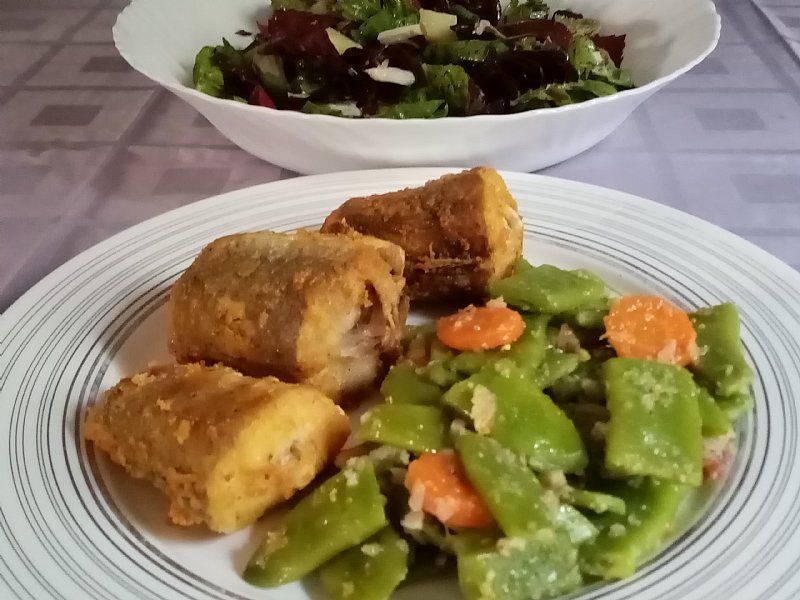Stročji fižol na česnu in drobtinah, pražen oslič; radič