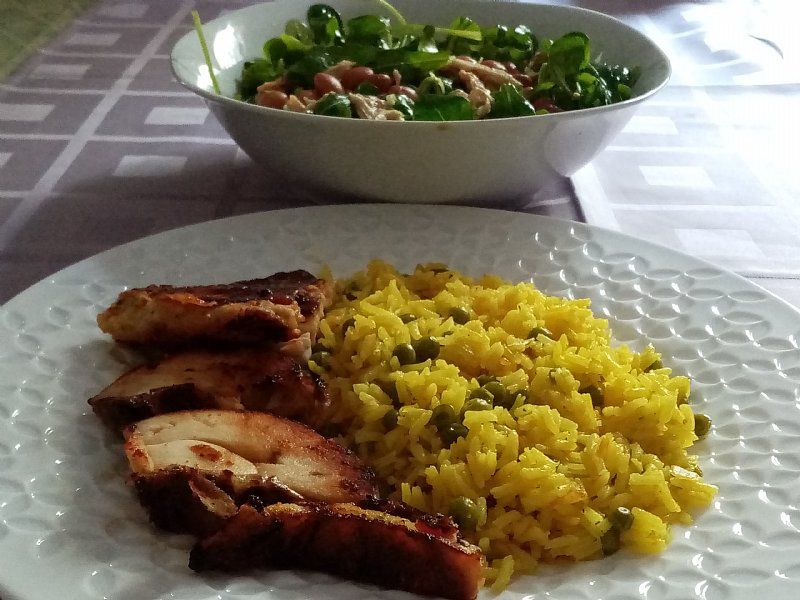 Basmati riž s kurkumo, piščančji koščki, motovilec