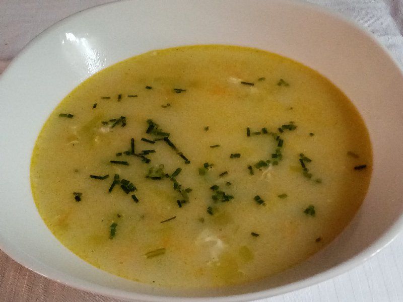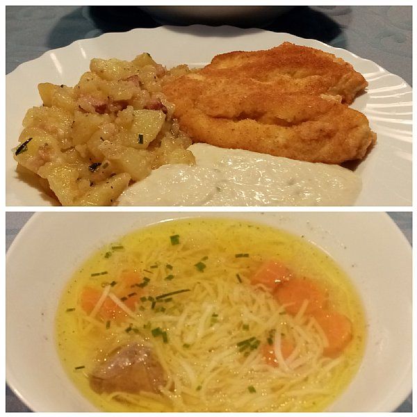 Piščančja juhica; pražen krompir, paniran piščančji zrezek, hrenova omaka, zelen