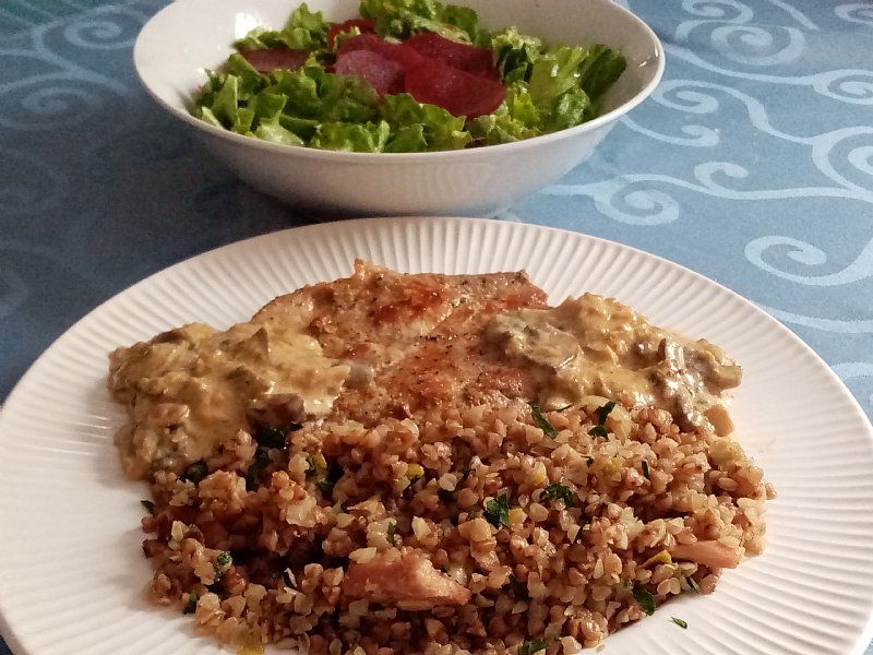 Piščančja juhica (od včeraj); ajdova kaša na poru in slanini, šampinjoni v omaki