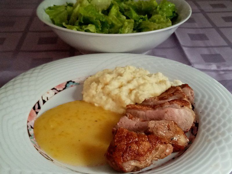 Račja prsa, pire zelena/krompir, pomarančna omaka; zelena solata