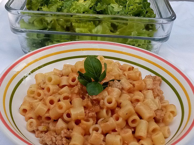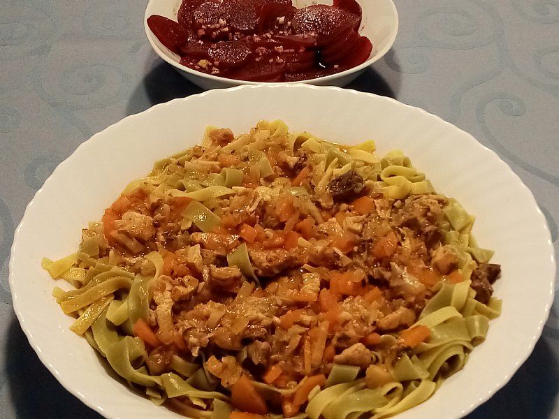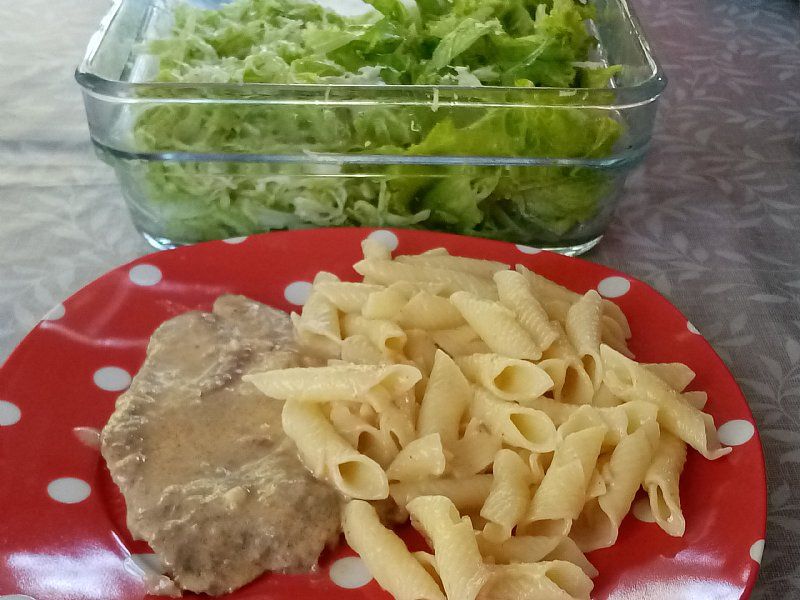 Goveji zrezki v omaki, fuži; zeleno-zeljnata solata
