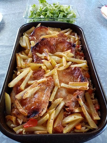 Basmati riž s porom in malancani, praženi in frigani lignji; zeljnata solata; tu