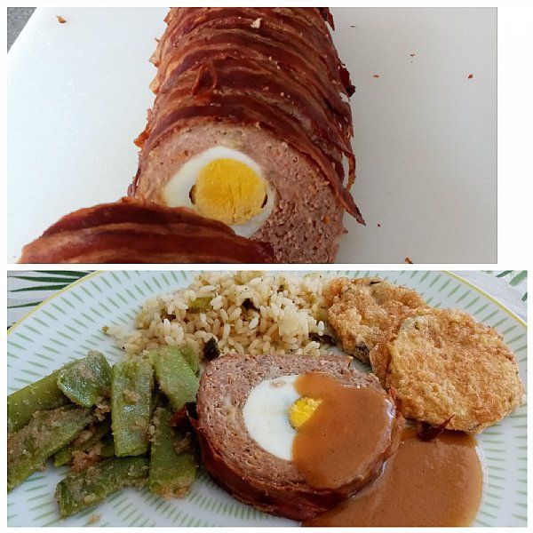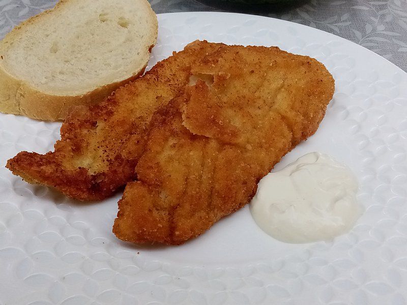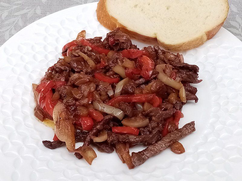 Goveji trakci s čebulo, bučkami in papriko; kruh; zeljnata solata