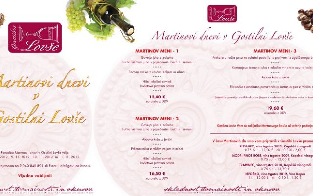 Ponudba Martinovi dnevi v Gostilni Lovše velja 3.11.2012, 9.11.2012, 10.11.2012 in 11.11.2012. Rezervacija je zaželjena na T: 040 840 891 / E-MAIL : info@gostilna-lovse.si