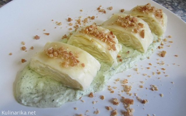 Polnozrnati peresniki z omako iz bučk, čebule in mandljev