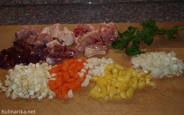 Narezan piščančji hrbet, drobovina, korenček, zelena, koren peteršilja, čebula.