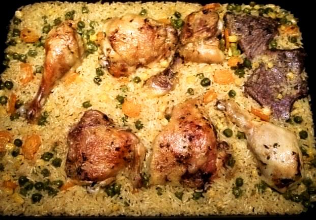 Piščanec z rižem, grahom, koruzo in korenčkom v pečici