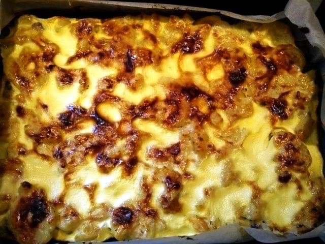 Pod krompirjem se skrivajo kolutki popečene dimljene klobase ...