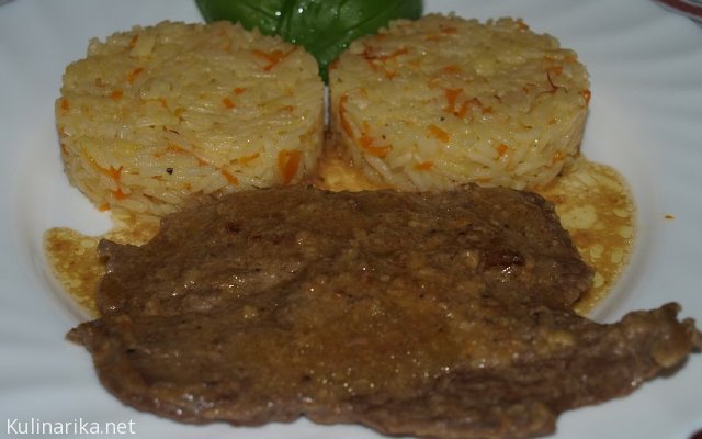 Goveji zrezek v temni omaki, riž z naribanim korenčkom
