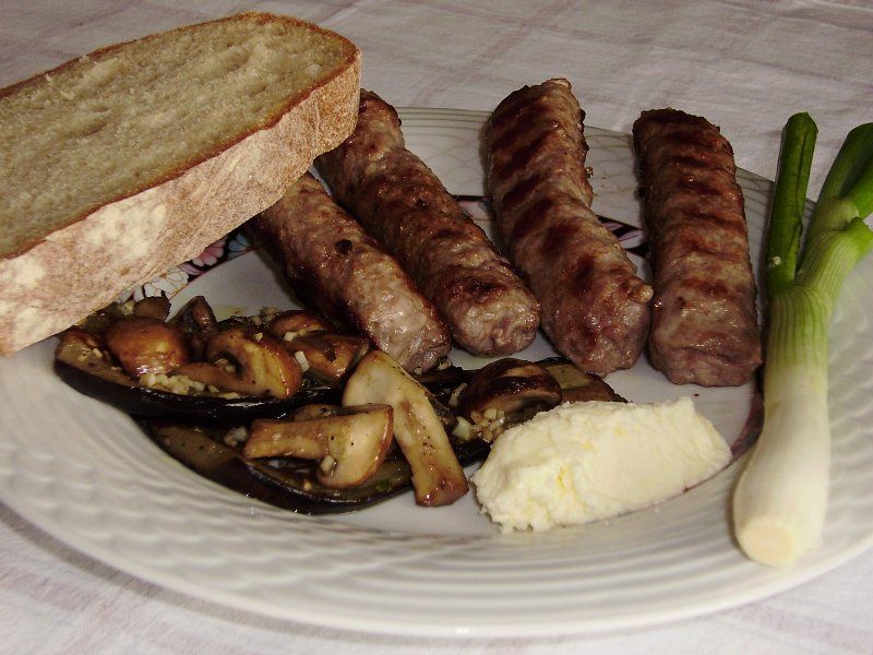 Čevapčiči, prepraženi malancani in šampinjoni - posuti s česnom in peteršiljem