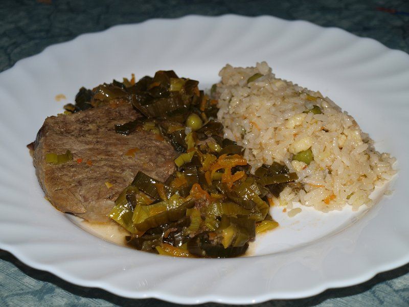 Reciklaža riža, omaka s porom in korenčkom, govedina iz juhe