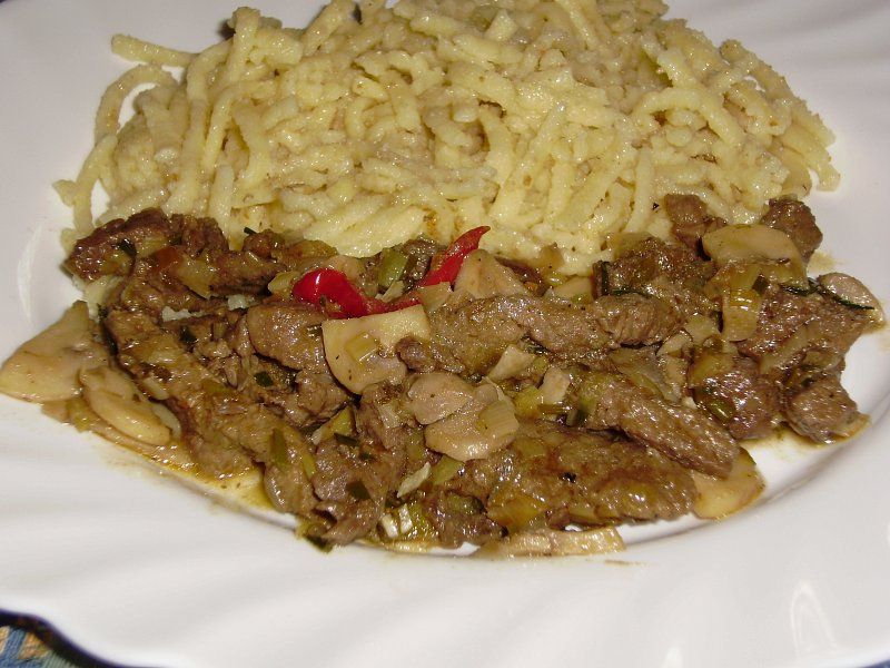 Govedina na trakce, por, mlada čebula, paprika, šampinjoni - vse zalito z vinom