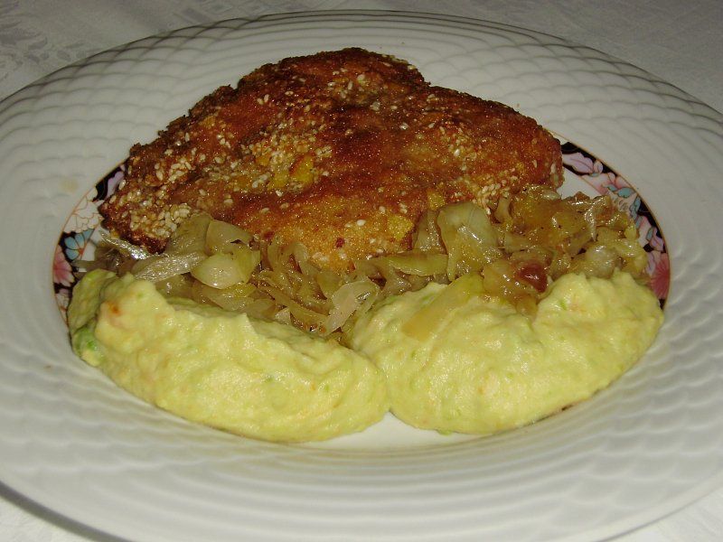 Panirani puranji zrezek, pire (krompir, korenje, zelena, grah), praženo sladko
