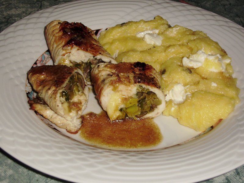 Puranji zvitki nadevani s porom, sirom in šampinjoni, polenta s feto
