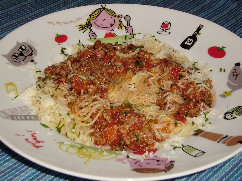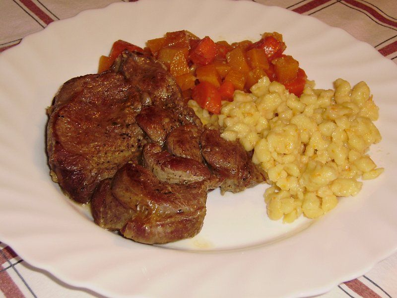 Špecli s korenčkom, repa s korenčkom, telečji zrezek v omaki