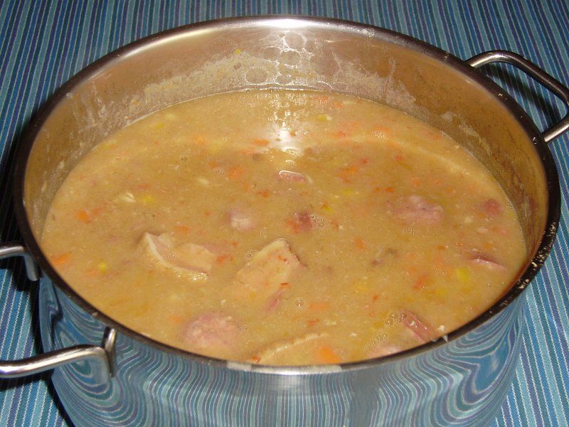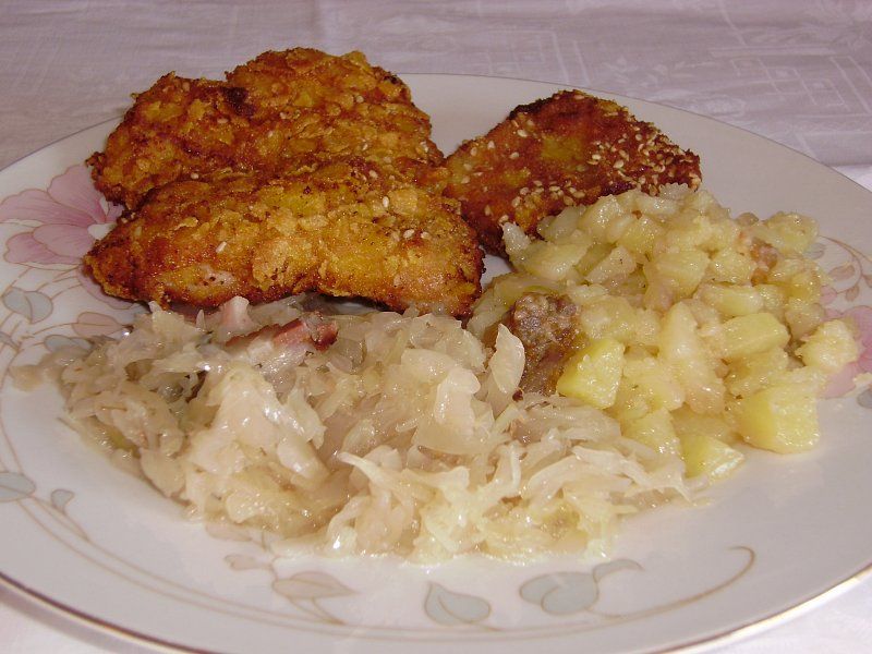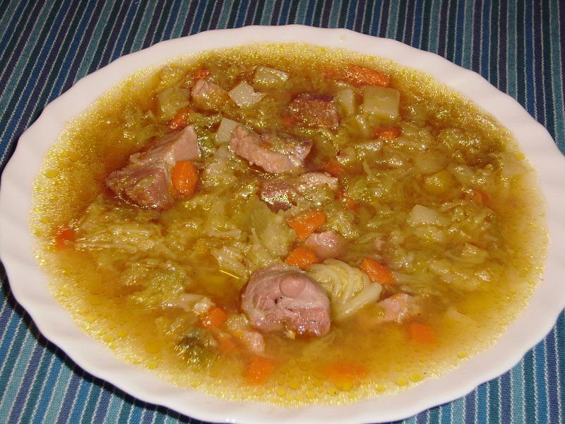 Kisla repa s koščkom suhih rebr, ajdovi žgančki, krvavice
