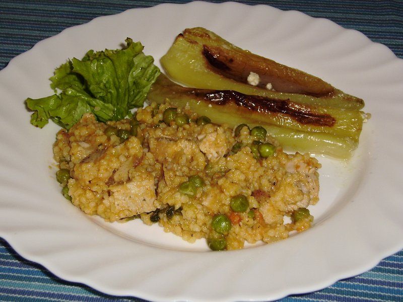 Prosena kaša na poru in grahu, puranji zrezek v korenčkovi omaki