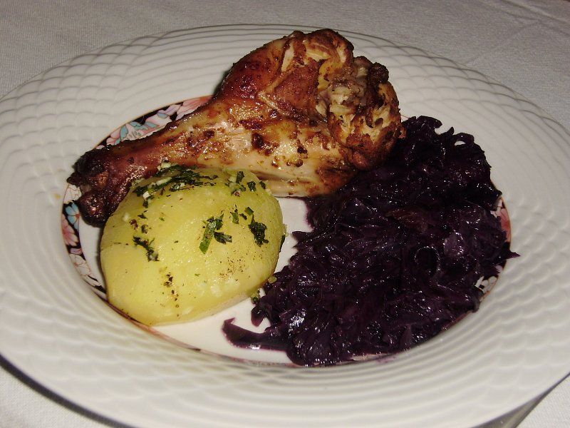Pečena puranja perutnička, dušeno rdeče zelje, pečen krompir s česnom in peterš