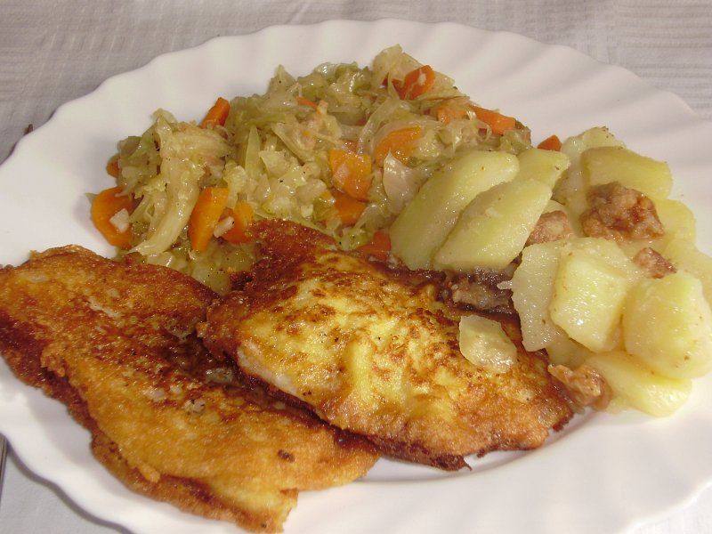 Sladko zelje s korenčkom, zabeljen krompir, ribji file v pivskem testu