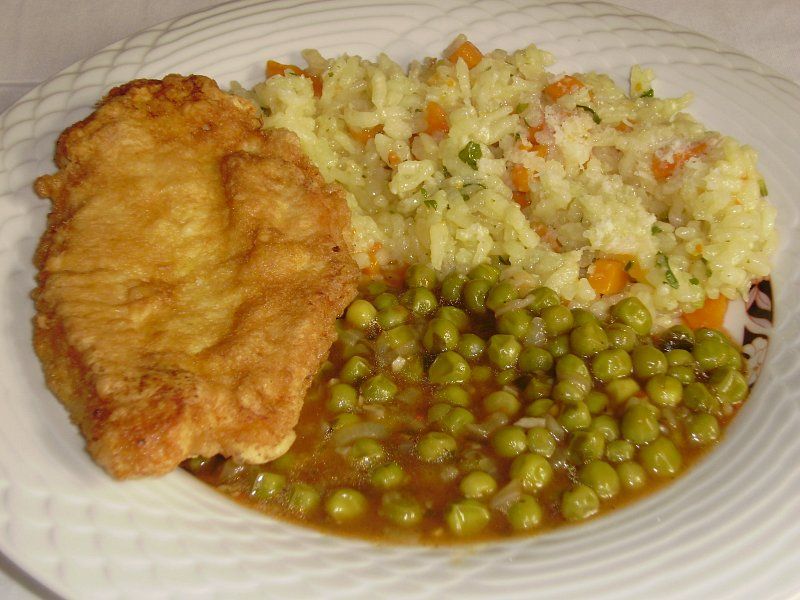 Zelenjavni rižoto, puranji koščki v vinsko-česnovi omaki