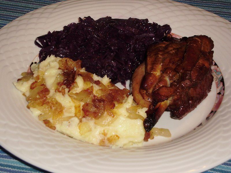 Pečena puranja perutnička, rdeče zelje, pire s čebulo