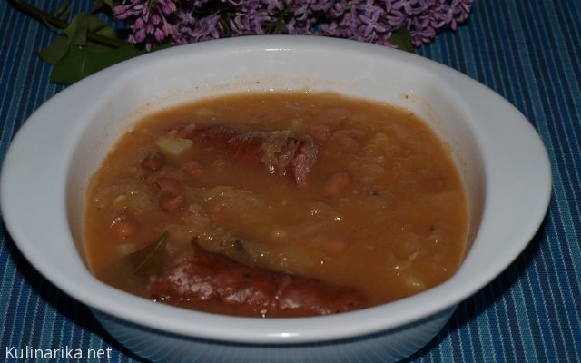 Dva rdeča korenčka, en rumen korenček in zeleno očisti ter nareži na enakomerne kockice. Nakockano zelenjavo dodaj na čebulo in klobaso, premešaj ter na kratko poduši. Z luknjičasto lopatko dodaj ohrovt, podlij z vodo, soli, vegetaj, popraj... posodo pokrij in pusti da se kuha.