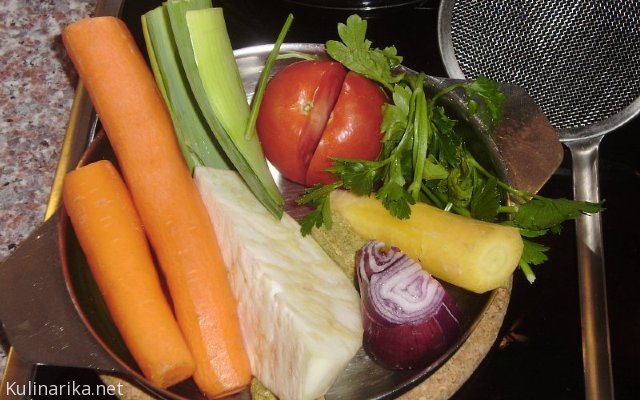 Dva rdeča korenčka, en rumen korenček in zeleno očisti ter nareži na enakomerne kockice. Nakockano zelenjavo dodaj na čebulo in klobaso, premešaj ter na kratko poduši. Z luknjičasto lopatko dodaj ohrovt, podlij z vodo, soli, vegetaj, popraj... posodo pokrij in pusti da se kuha.