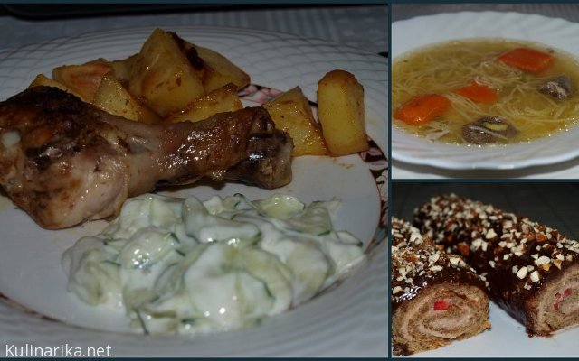 Piščančja juha, pečene piš.nogice, krompir, kumare v jogurtu, skuštrana rolada