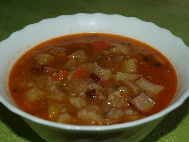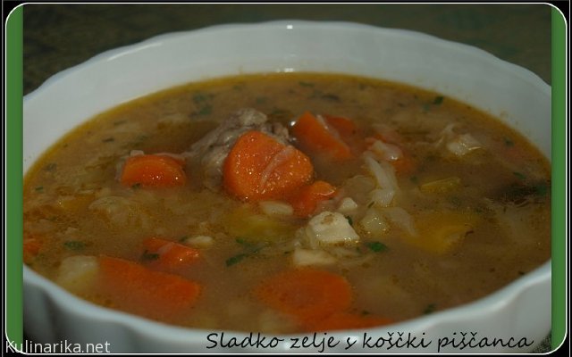Dva rdeča korenčka, en rumen korenček in zeleno očisti ter nareži na enakomerne kockice. Nakockano zelenjavo dodaj na čebulo in klobaso, premešaj ter na kratko poduši. Z luknjičasto lopatko dodaj ohrovt, podlij z vodo, soli, vegetaj, popraj... posodo pokrij in pusti da se kuha.