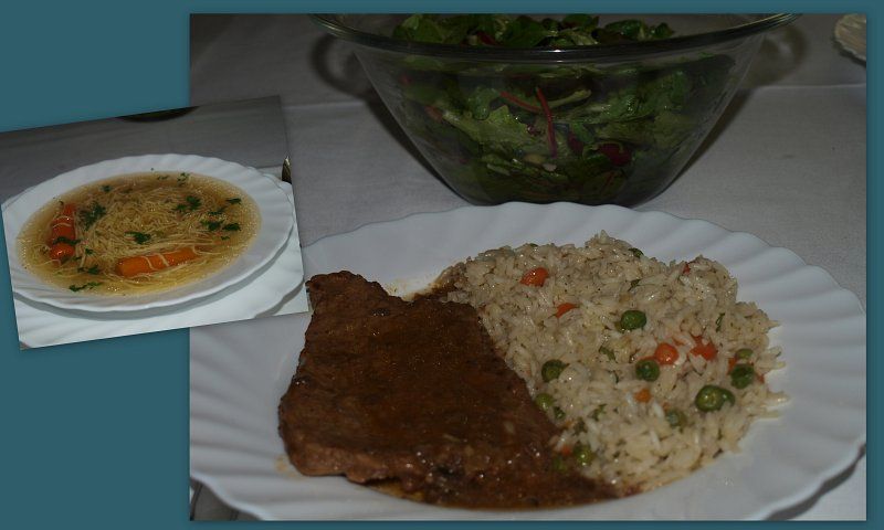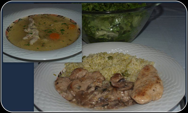 Kokošja juhica; sv. ribica in pišč. file s šampinjoni, podolgovat riž z grahom