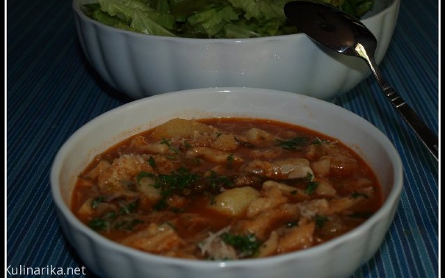 Dva rdeča korenčka, en rumen korenček in zeleno očisti ter nareži na enakomerne kockice. Nakockano zelenjavo dodaj na čebulo in klobaso, premešaj ter na kratko poduši. Z luknjičasto lopatko dodaj ohrovt, podlij z vodo, soli, vegetaj, popraj... posodo pokrij in pusti da se kuha.