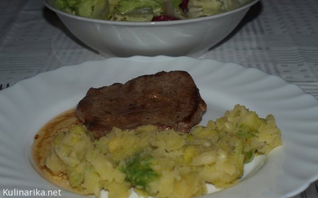 Pečena vratovina, krompir v kosih z brstičnim ohrovtom; endivija in radič