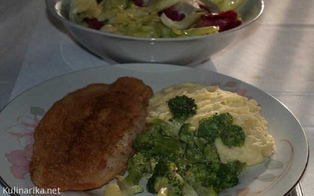 Pražen ribji file, pire krompir, brokoli v omaki; solata: endivija/radič
