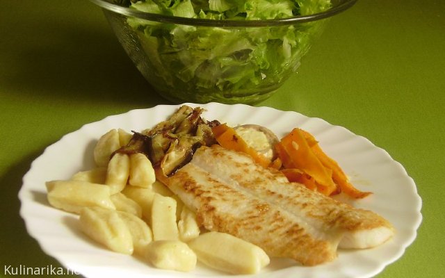 Bučni njoki, melancan in korenček s česnom, šampinjon nadevan s feto, ribji file