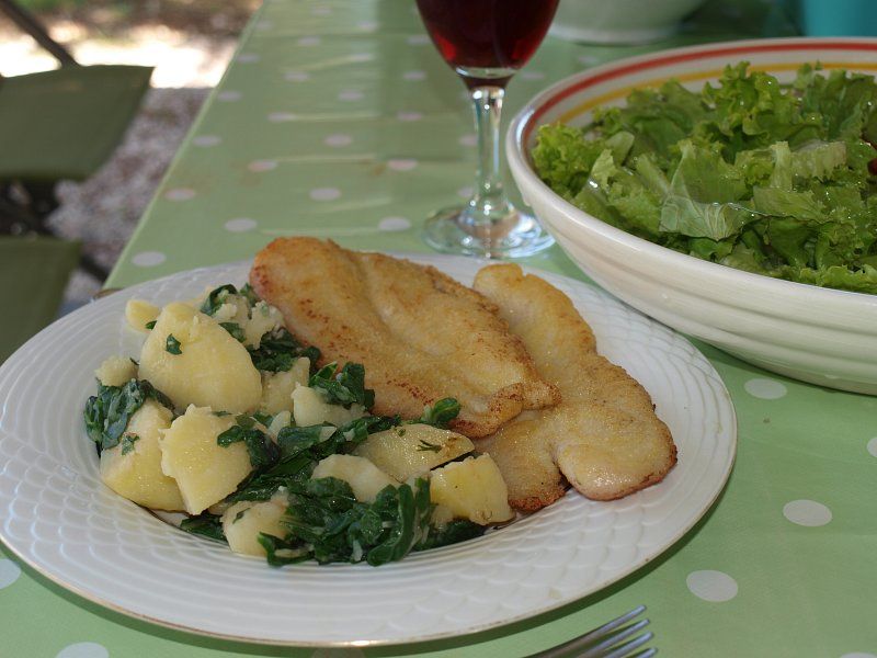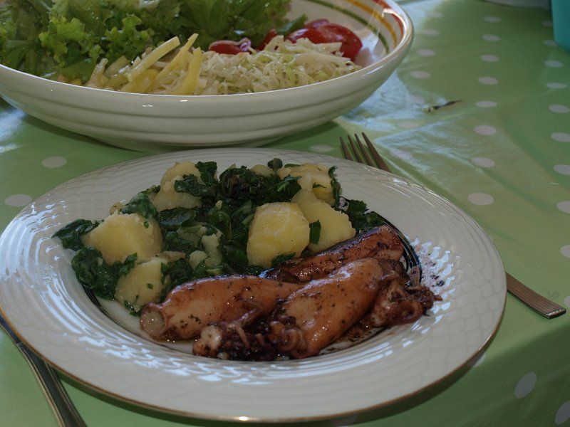 Krompir z blitvo, ribji file, nadevani kalamari, mešana solata