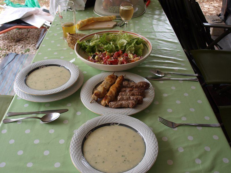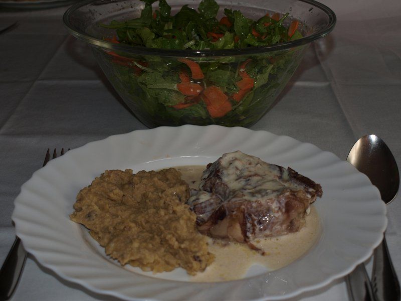 Čičerika s čebulo in česnom, govedina iz juhe v beli omaki; berivka-rukola