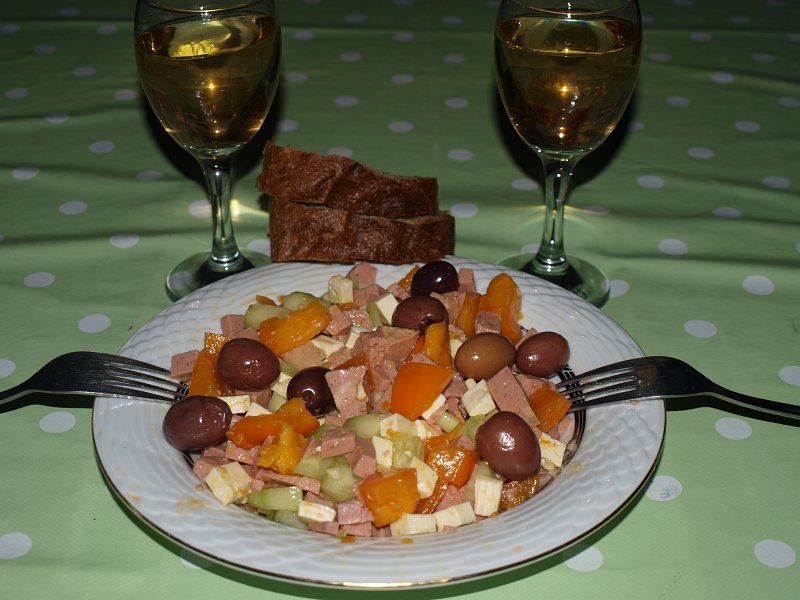 Makarončki preliti s "sataraš" omako, zelje in zelena solata