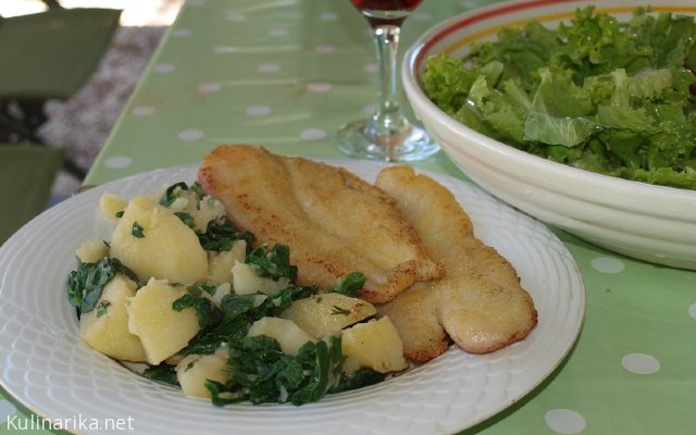 Korenček, zelena in por iz voka; paniran puranji zrezek