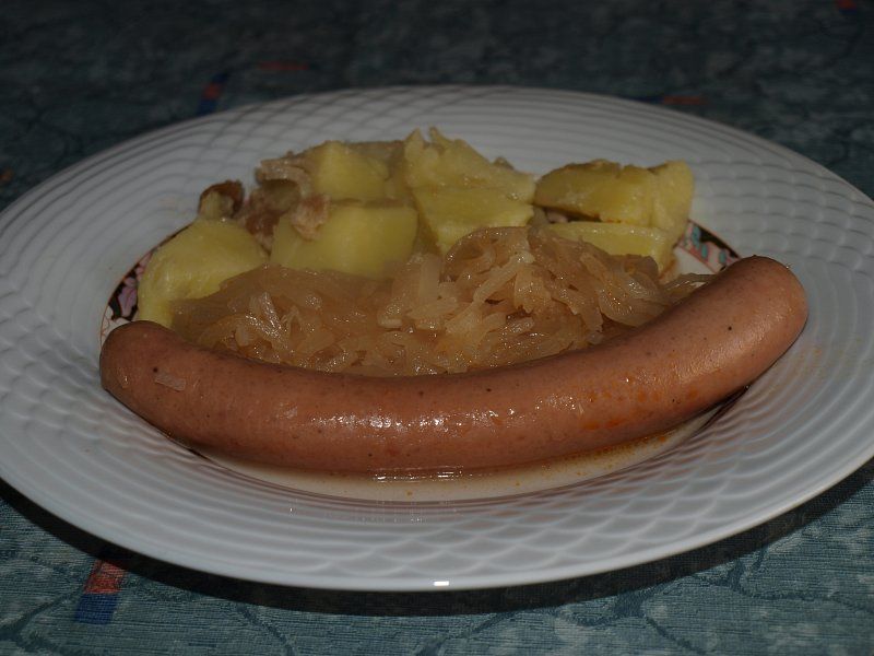 Kisla repa, zabeljen krompir v kosih, hrenovka