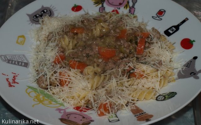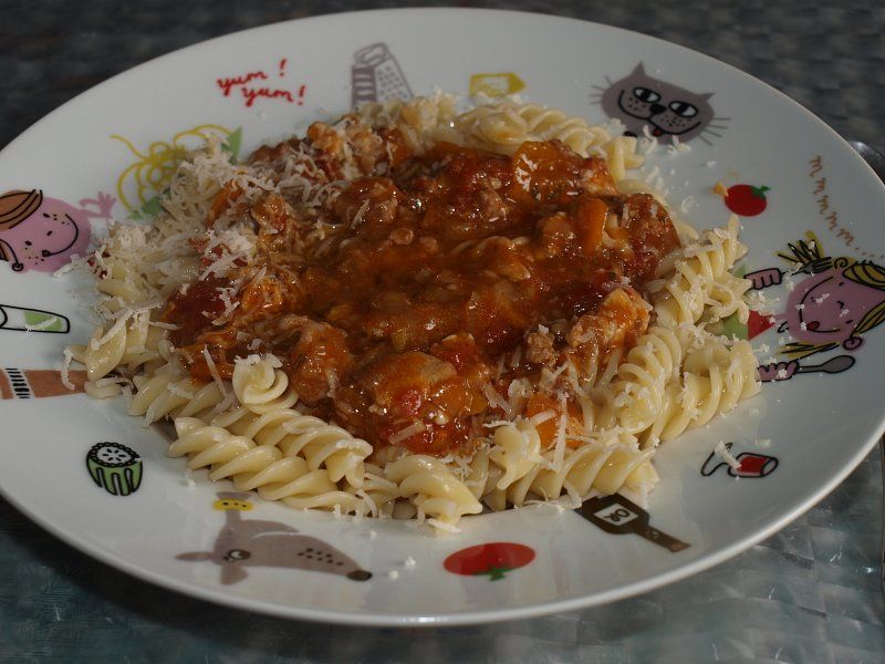 Puranje-zelenjavna omaka, svedrčki (posuto s parmezanom)