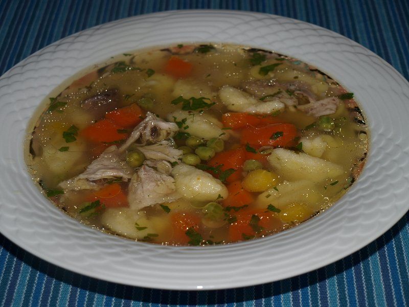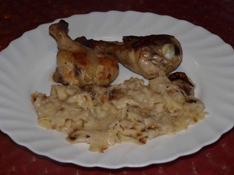 Krompirjevi svaljki, piščančji koščki z jurčki v smetanovi omaki