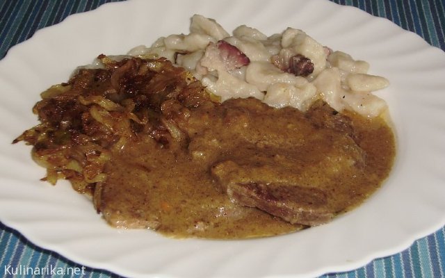 Goveji zrezki v omaki, "ščipanci" s slanino, prepražena čebula