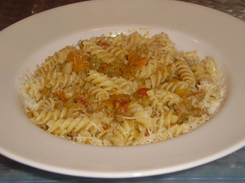 Casarecce iz čičerike z bučo, porom, brokolijem, šetrajem, parmezanom in olivami