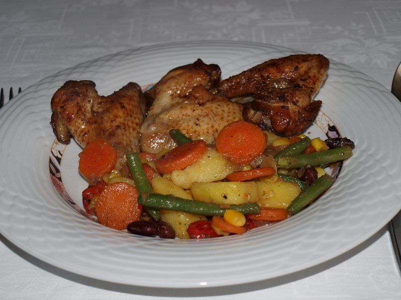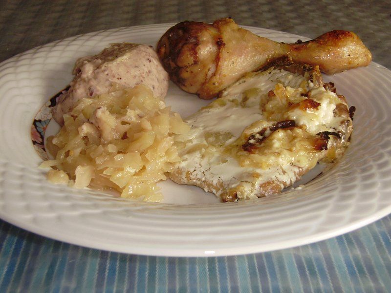 Dušeno sladko zelje, matevž, sv.zrezek prelit s sladko smetano, pečeno piš.bedro