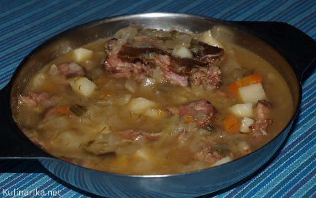 Dva rdeča korenčka, en rumen korenček in zeleno očisti ter nareži na enakomerne kockice. Nakockano zelenjavo dodaj na čebulo in klobaso, premešaj ter na kratko poduši. Z luknjičasto lopatko dodaj ohrovt, podlij z vodo, soli, vegetaj, popraj... posodo pokrij in pusti da se kuha.