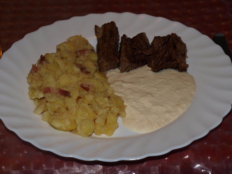 Pražen krompir, popečena govedina iz juhe, hrenov zos
