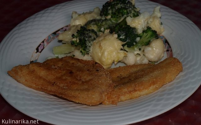 Popečen ribji file; zapečen brokoli in karfiola, posuto s sirom