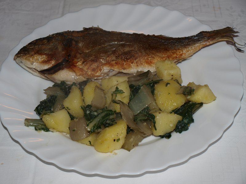 Pečena orada, krompir v kosih z dušeno blitvo in česnom