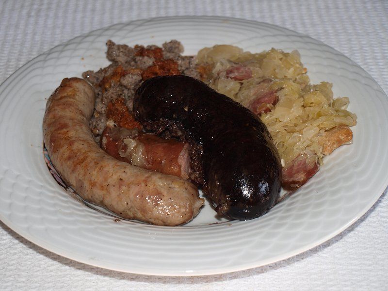 Dušeno kislo zelje, krvavica, pečenicain suha klobasa, zabeljeni ajdovi žganci